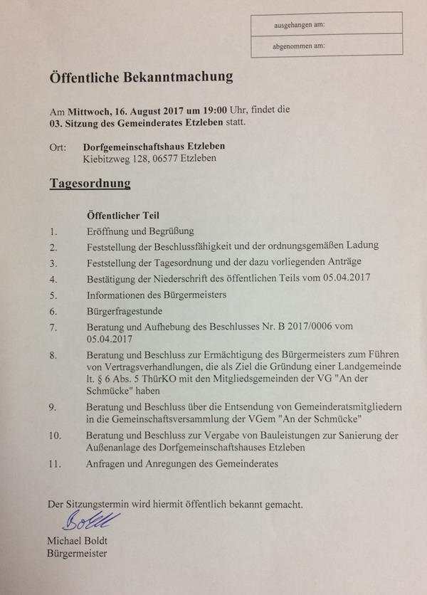 | ausgehangen am Gemeinde Etzleben öffentliche Bekanntmachung Am Mittwoch 16. August 2017, 19:00 Uhr findet die 03. Sitzung des Gemeinderates Etzleben statt.