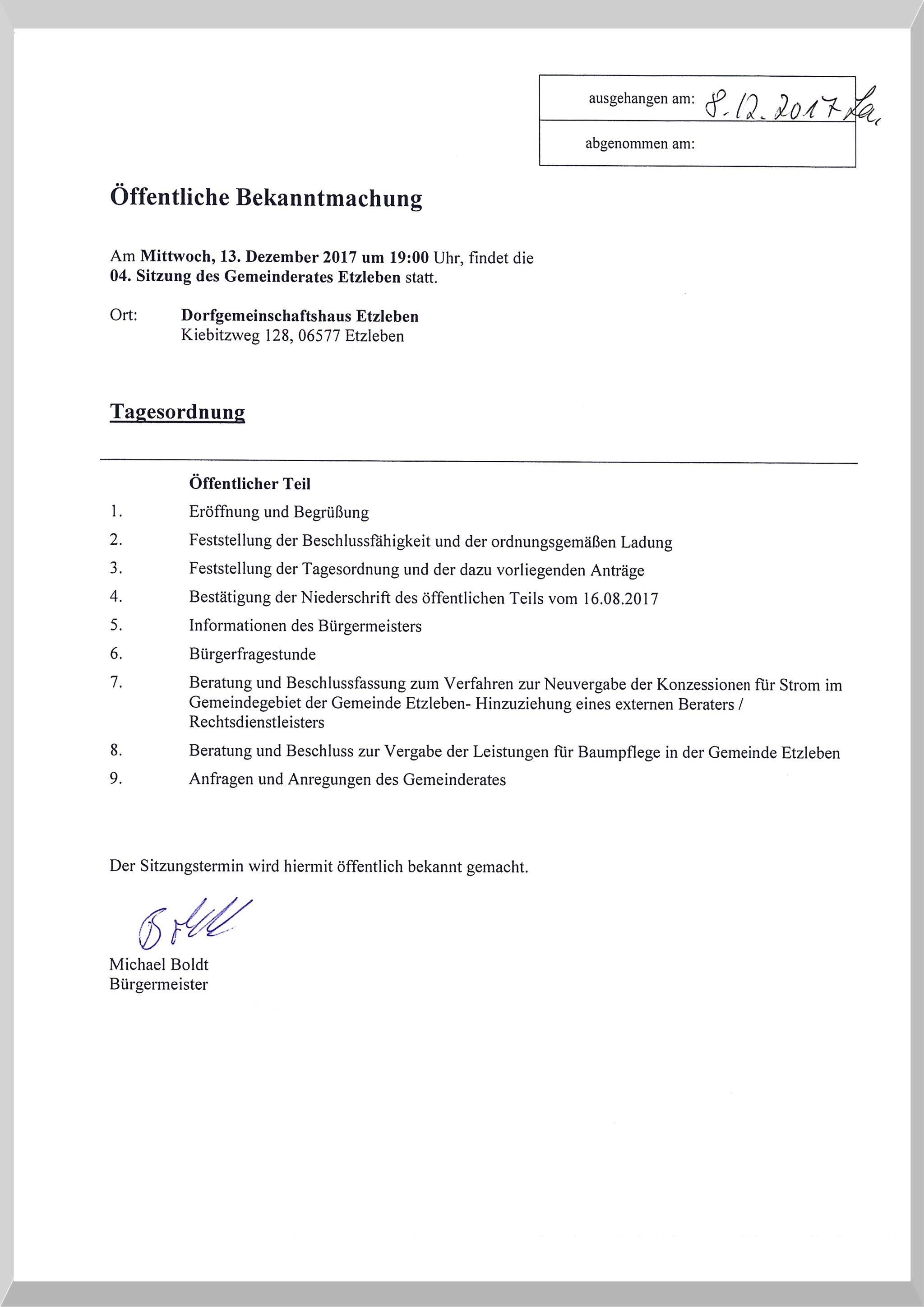 | ausgehangen am: 08.12.2017 Gemeinde Etzleben öffentliche Bekanntmachung Am Mittwoch 13. August 2017, 19:00 Uhr findet die 04. Sitzung des Gemeinderates Etzleben statt.