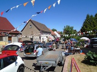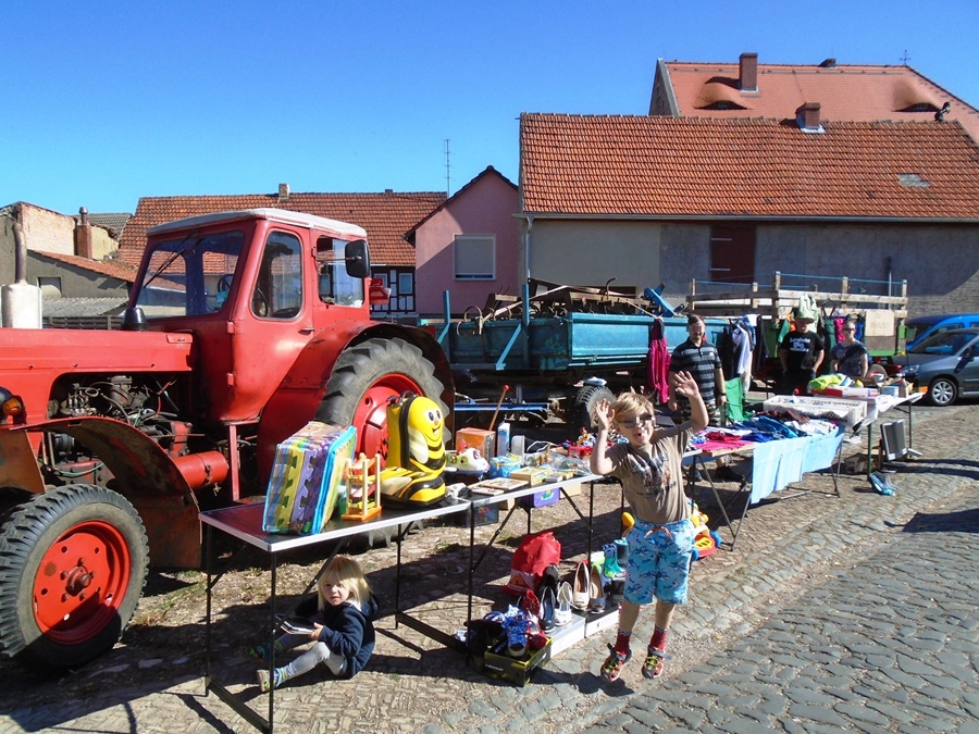 Damit haben sie uns „…den Arsch gerettet“, so der Bürgermeister Michael Boldt. So gelang es statt durchschnittlich 500 PKW´s nun sogar über 800 Autos einen Parkplatz im Dorfbereich anzubieten. Auch auf allen anderen Gebieten konnte der 6. Flohmarkt mit vielen neuen Rekorden aufwarten. Neben den Familien Windrich, Schneider, Kämpfe, Mendler und Stang öffnete erstmals Frau Isa Hauboldt ihren Drei- Seiten- Hof und bot Kaffee und Kuchen an. Mit 23 Hobbytrödlern aus dem Dorf und 65 Flohmärktlern aus 24 Städten und Dörfern von Artern bis Weimar erreichten wir mit 87 einen neuen Teilnehmerrekord. Aber genügend Platz war für jeden Teilnehmer da und den Stau der beim Aufbau der Stände zwischen den Autos, die auf den Schulplatz wollten und jenen, die ihren Stand schon aufgebaut hatten, und nun das Auto im hinteren Dorfbereich parken wollten, entstand, ertrugen alle mit viel Geduld.
