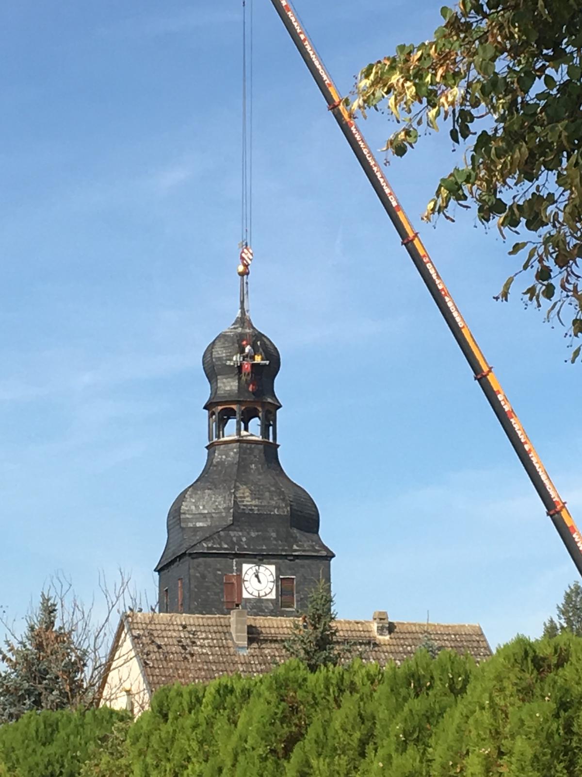 Hoch überragte ein Autokran am 17./18. September 2018 den immerhin 34 m hohen Turm unserer Kirche St. Laurentius um noch vor dem Winter lose Schiefer zu befestigen und fehlende zu ersetzen.