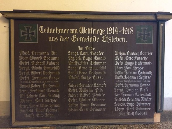 Hieran erinnert das im Denkmalsgarten gelegene "große Kriegerdenkmal", in früheren Zeiten auch Heldendenkmal genannt. Mit dem Denkmal gedachte Etzleben der im 1. Weltkrieg gefallenen 15 Einwohner, welche nicht nur auf den Tafeln in der Kirche, sondern auch an der Ostseite des Denkmals namentlich aufgeführt sind. Darunter auch mit gerade einmal 19 Jahren der Infanterist Alwin Ewald und der Kraftfahrer Albin Steinacker. Unter den Toten aber auch Unteroffizier Kurt Mackrodt als letzter Nachkomme des Klostergutbesitzers Friedrich Herrmann Mackrodt. Diesem blieb nach dem Tod seines Sohnes letztlich nichts anderes, als die zum Gut gehörigen Ländereien zu verkaufen.